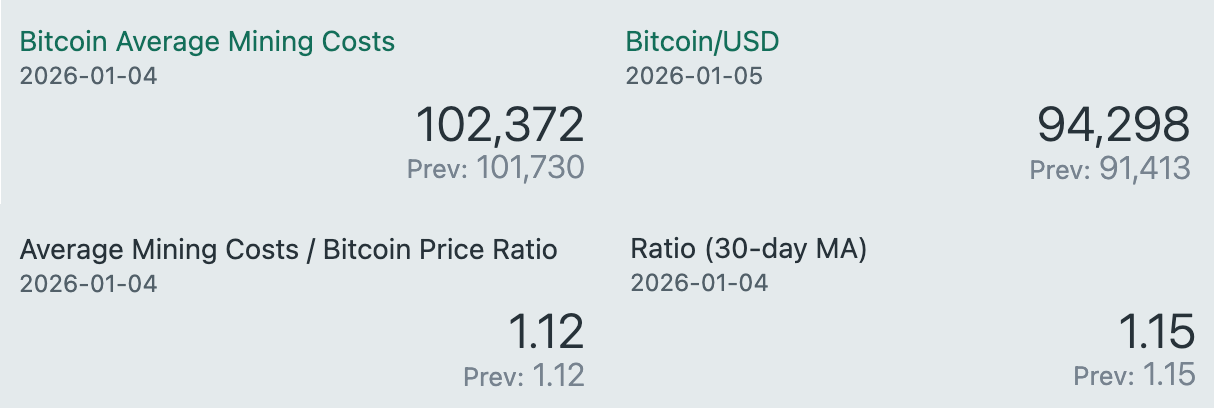 As of early January 2026, the average cost to mine one Bitcoin is estimated at $102,372, modestly higher than last month’s $101,730. With Bitcoin trading near $94,300, the mining cost-to-price ratio has eased to approximately 1.12, while the 30-day moving average of the ratio sits at 1.15, largely unchanged from the prior period.
