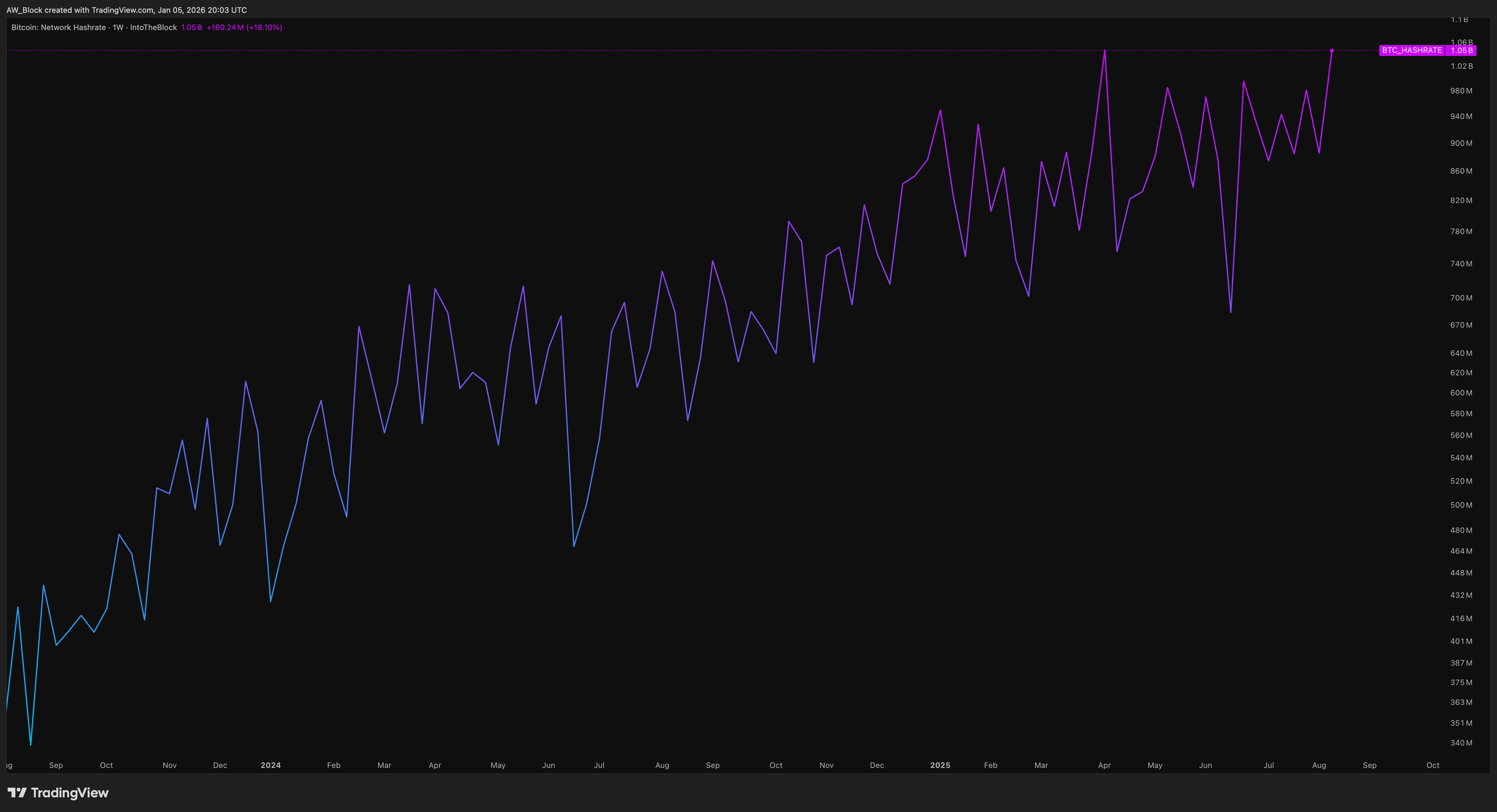 Bitcoin’s network hashrate has continued to press higher, holding near cycle highs around 1.05 billion TH/s despite extended price consolidation. The broader structure remains defined by higher lows, with recent drawdowns proving shallow and short-lived relative to the prevailing uptrend in computational power.