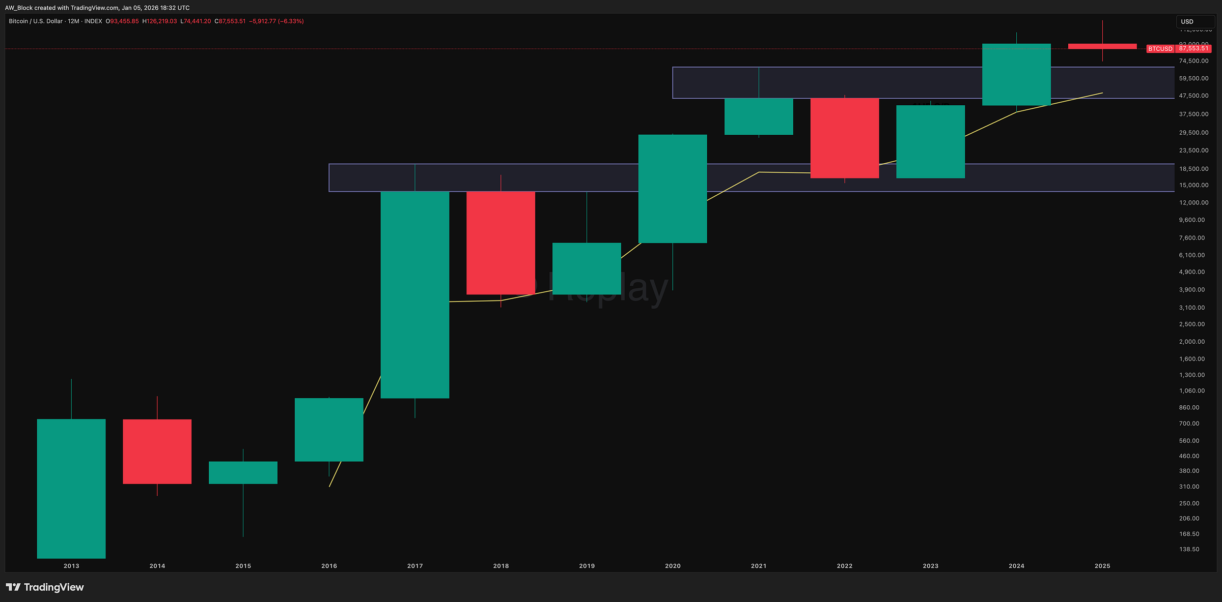 Bitcoin remains in a secular bull trend on the yearly timeframe, consolidating above former all-time highs with no topping structure in place.