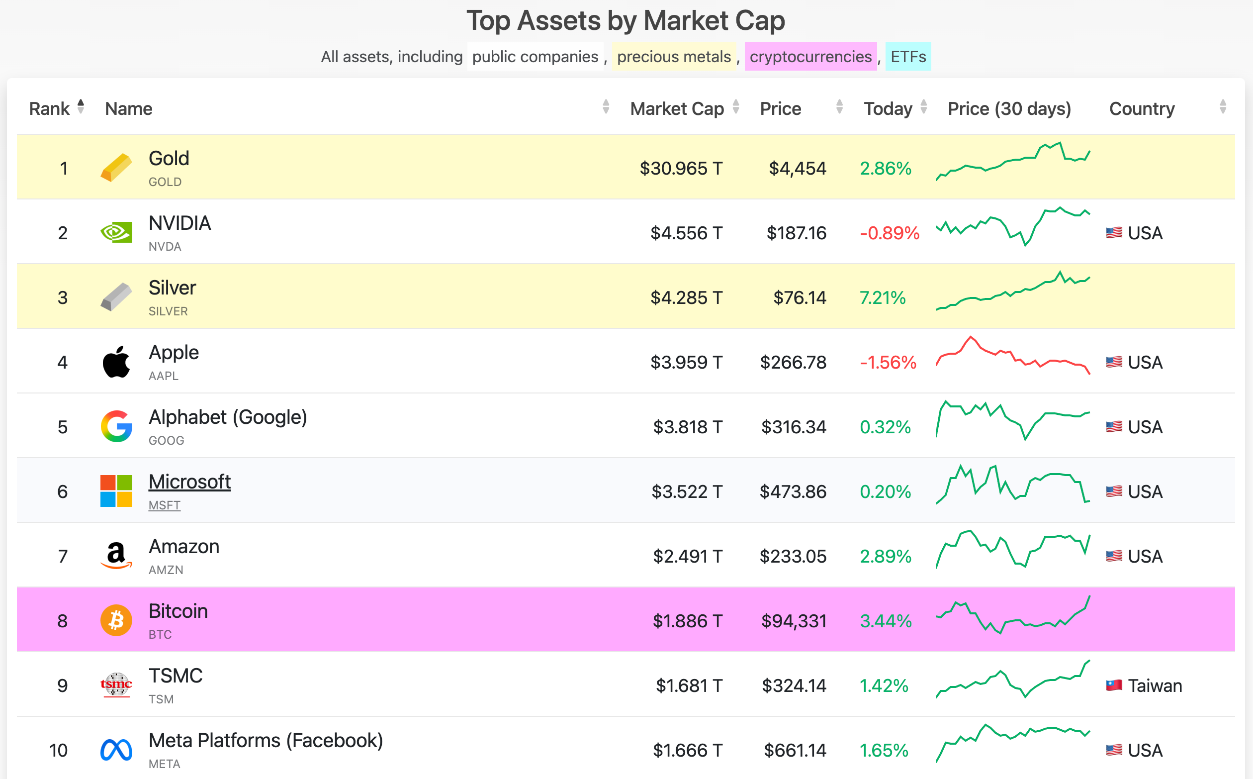 The broader leaderboard highlights a familiar divergence. Gold continues to dominate the store-of-value category at over $30 trillion, while equities such as NVIDIA, Apple, Microsoft, and Alphabet retain elevated valuations driven by equity-specific capital flows. Silver has pushed higher as well, reflecting renewed interest in hard assets during macro uncertainty.